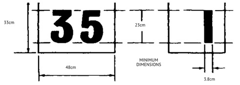 Numbers must be displayed in a durable manner and be black, of a minimum size of 23cm high with stroke width of a minimum of 3.8cm on a white oblong background measuring not less than 48cm x 33cm which must extend at least 5cm beyond the outline of the numbers. Alternatively, the numbers may be displayed on a white circular background provided that the background extends at least 5cm beyond the outline of the numbers.