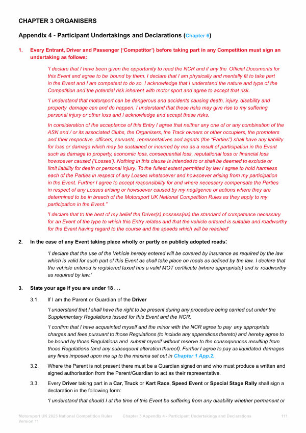 3.3. Every Driver taking part in a Car, Truck or Kart Race, Speed Event or Special Stage Rally shall sign a declaration in the following form: