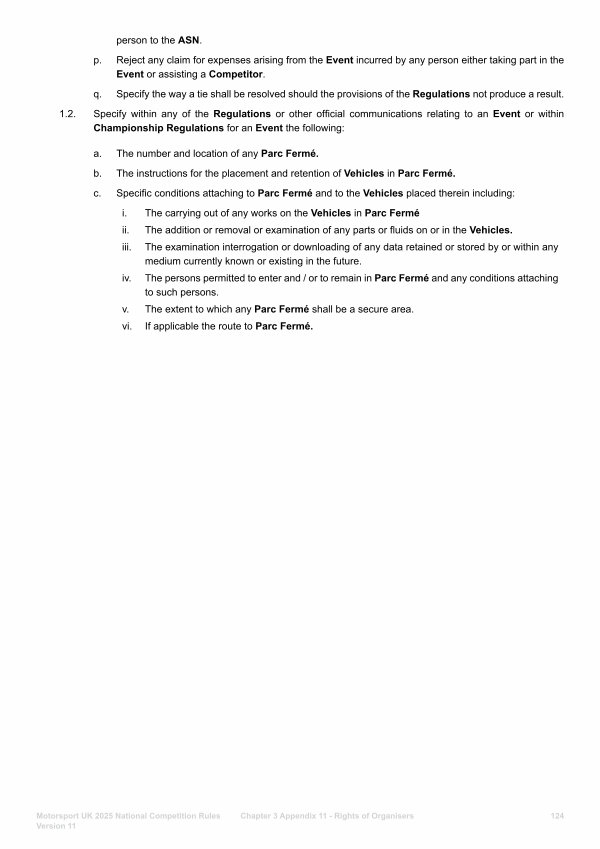 a. The number and location of any Parc Fermé. b. The instructions for the placement and retention of Vehicles in Parc Fermé. c. Specific conditions attaching to Parc Fermé and to the Vehicles placed therein including: i.