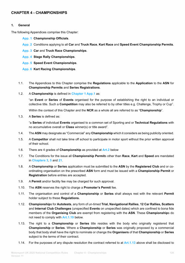 1. General The following Appendices comprise this Chapter: App. 1 Championship Officials. App. 2 Conditions applying to all Car and Truck Race, Kart Race and Speed Event Championship Permits. App. 3 Car and Truck Race Championships. App. 4 Stage Rally Championships. App. 5 Speed Event Championships. App. 6 Kart Racing Championships.