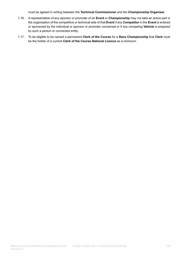 1.17. To be eligible to be named a permanent Clerk of the Course for a Race Championship that Clerk must be the holder of a current Clerk of the Course National Licence as a minimum.