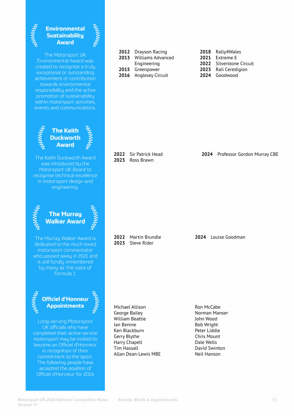 Long-serving Motorsport UK officials who have completed their active service motorsport may be invited to become an Officiel d’ Honneur in recognition of their commitment to the sport. The following people have accepted the position of Officiel d’ Honneur for 2024