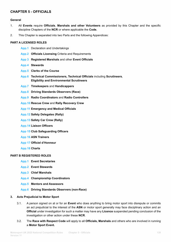 App. 7 Timekeepers and Handicappers App. 8 Driving Standards Observers( Race) App. 9 Radio Coordinators and Radio Controllers App. 10 Rescue Crew and Rally Recovery Crew App 11 Emergency and Medical Officials App. 12 Safety Delegates( Rally) App. 13 Safety Car Crew( Rally) App. 14 Liaison Officers App 15 Club Safeguarding Officers App 16 ASN Trainers App 17 Officiel d’ Honneur App. 18 Charts