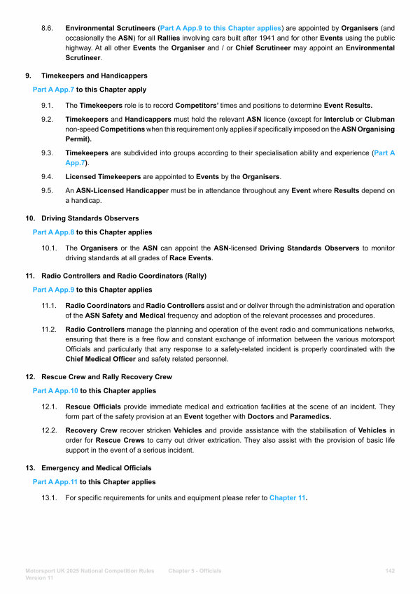 8.6. Environmental Scrutineers( Part A App. 9 to this Chapter applies) are appointed by Organisers( and occasionally the ASN) for all Rallies involving cars built after 1941 and for other Events using the public highway. At all other Events the Organiser and / or Chief Scrutineer may appoint an Environmental Scrutineer.