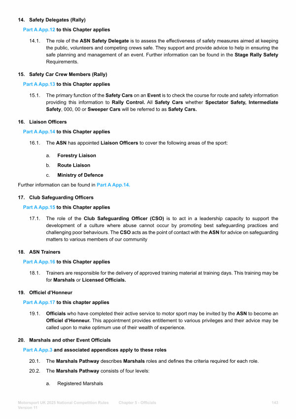 14.1. The role of the ASN Safety Delegate is to assess the effectiveness of safety measures aimed at keeping the public, volunteers and competing crews safe. They support and provide advice to help in ensuring the safe planning and management of an event. Further information can be found in the Stage Rally Safety Requirements.