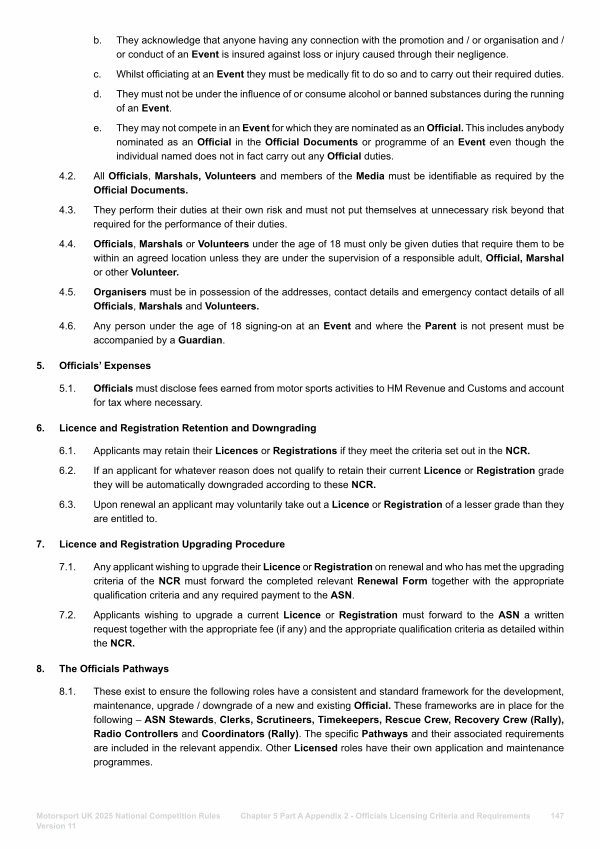 8.1. These exist to ensure the following roles have a consistent and standard framework for the development, maintenance, upgrade / downgrade of a new and existing Official. These frameworks are in place for the following – ASN Stewards, Clerks, Scrutineers, Timekeepers, Rescue Crew, Recovery Crew( Rally), Radio Controllers and Coordinators( Rally). The specific Pathways and their associated requirements are included in the relevant appendix. Other Licensed roles have their own application and maintenance programmes.