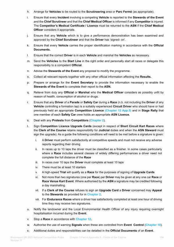 Ensure that every Incident involving a competing Vehicle is reported to the Stewards of the Event and the Chief Scrutineer and that the Chief Medical Officer is informed if any Competitor is injured. The Competitor’ s Medical Certificate / Licence must be returned to the ASN if the Chief Medical Officer considers it appropriate.