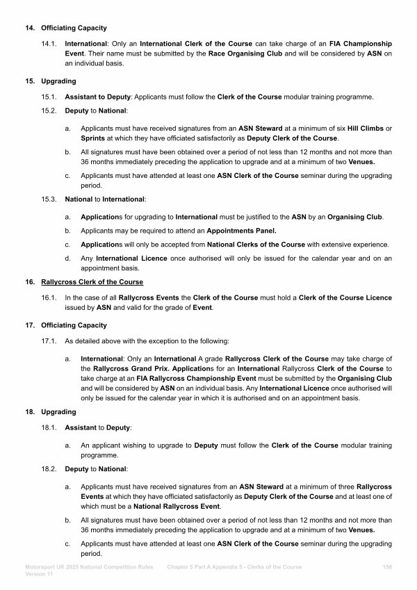 15. Upgrading 15.1. Assistant to Deputy: Applicants must follow the Clerk of the Course modular training programme. 15.2. Deputy to National: