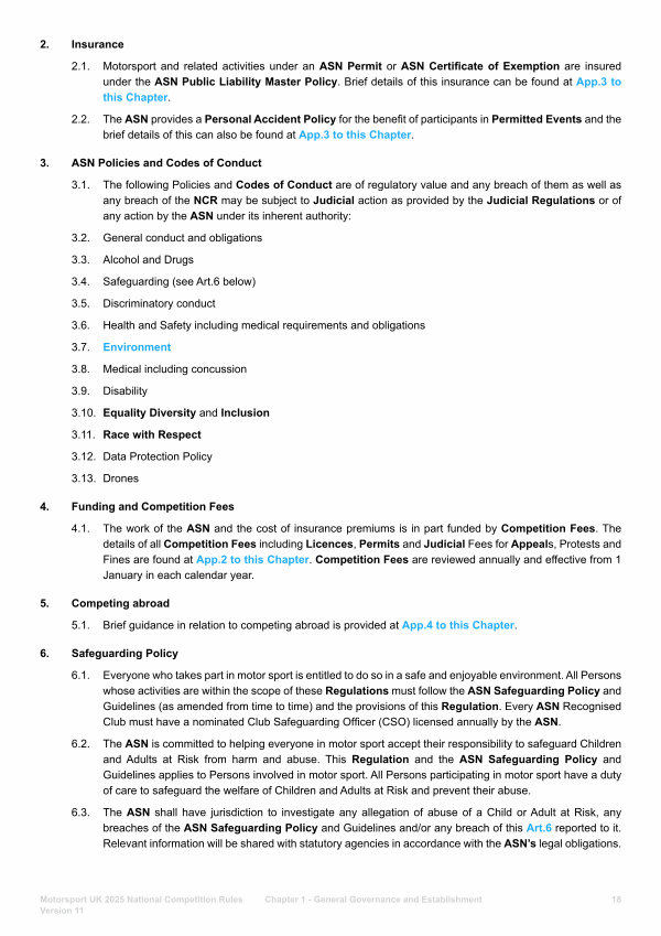 6.1. Everyone who takes part in motor sport is entitled to do so in a safe and enjoyable environment. All Persons whose activities are within the scope of these Regulations must follow the ASN Safeguarding Policy and Guidelines( as amended from time to time) and the provisions of this Regulation. Every ASN Recognised Club must have a nominated Club Safeguarding Officer( CSO) licensed annually by the ASN.
