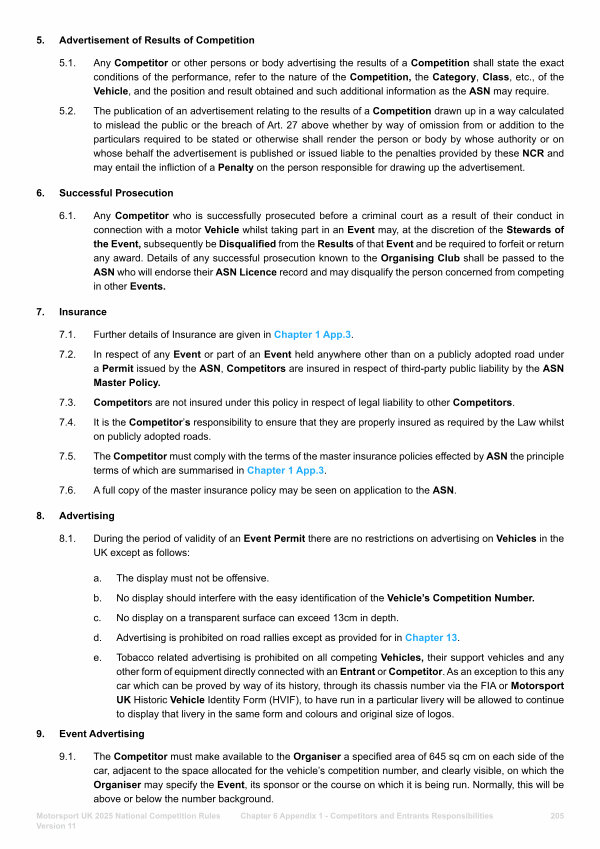 6.1. Any Competitor who is successfully prosecuted before a criminal court as a result of their conduct in connection with a motor Vehicle whilst taking part in an Event may, at the discretion of the Stewards of the Event, subsequently be Disqualified from the Results of that Event and be required to forfeit or return any award. Details of any successful prosecution known to the Organising Club shall be passed to the ASN who will endorse their ASN Licence record and may disqualify the person concerned from competing in other Events.