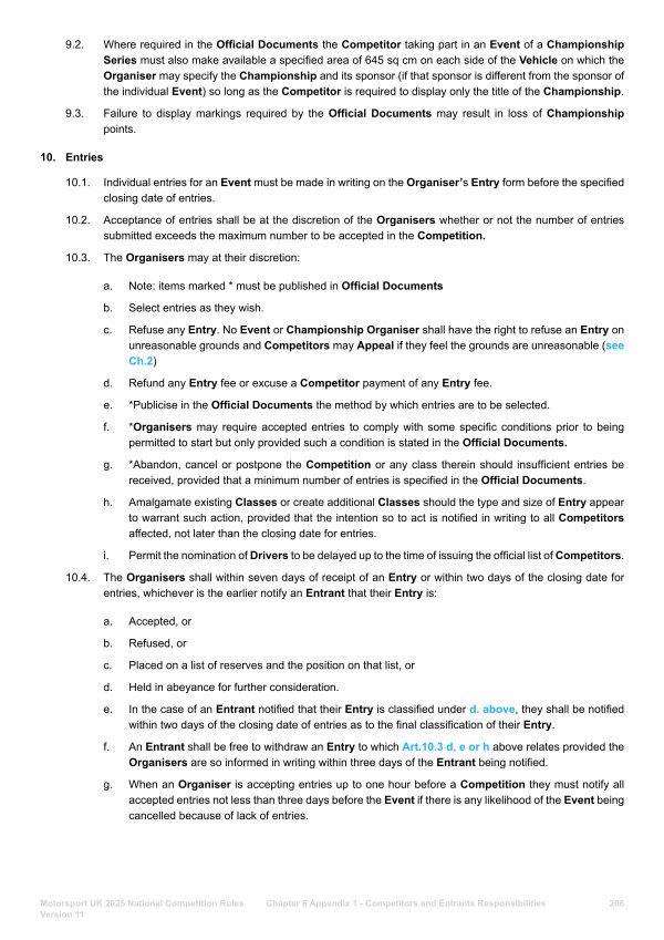 10.4. The Organisers shall within seven days of receipt of an Entry or within two days of the closing date for entries, whichever is the earlier notify an Entrant that their Entry is: