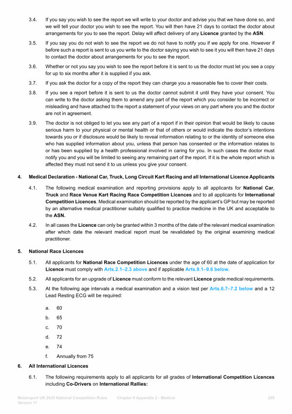 4.1. The following medical examination and reporting provisions apply to all applicants for National Car, Truck and Race Venue Kart Racing Race Competition Licences and to all applicants for International Competition Licences. Medical examination should be reported by the applicant’ s GP but may be reported by an alternative medical practitioner suitably qualified to practice medicine in the UK and acceptable to the ASN.
