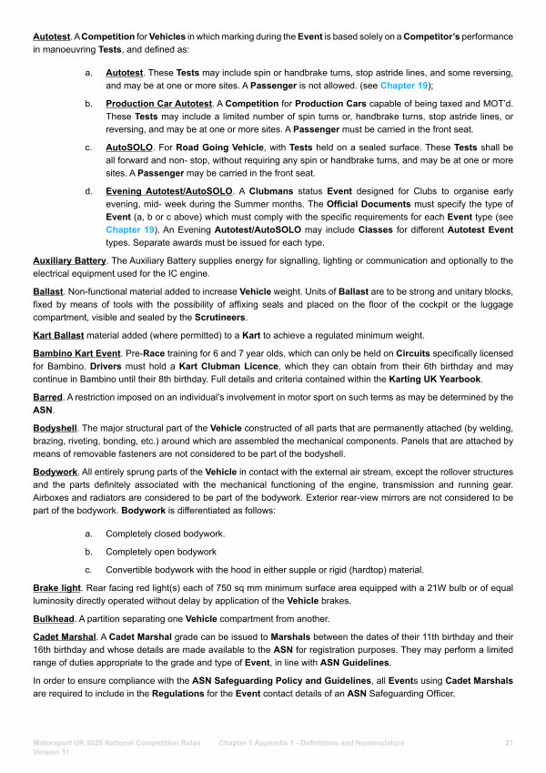 a. Autotest. These Tests may include spin or handbrake turns, stop astride lines, and some reversing, and may be at one or more sites. A Passenger is not allowed.( see Chapter 19);