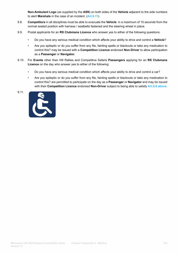 • Are you epileptic or do you suffer from any fits, fainting spells or blackouts or take any medication to control this? are permitted to participate on the day as a Passenger or Navigator and may be issued with their Competition Licence endorsed Non-Driver subject to being able to satisfy Art. 9.8 above.