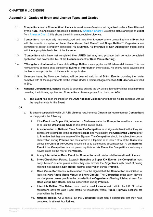 1.1. Competitors need a Competition Licence for most forms of motor sport organised under a Permit issued by the ASN. The Application process is depicted by Annex A Chart 1 Select the status and type of Event from Annex A Chart 2 this shows the minimum acceptable Licence.
