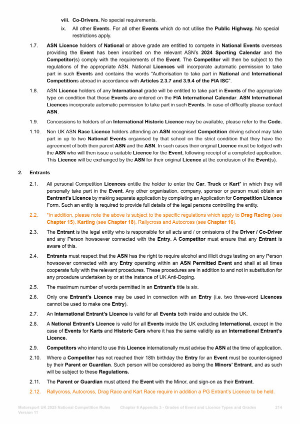2.2. * In addition, please note the above is subject to the specific regulations which apply to Drag Racing( see Chapter 15), Karting( see Chapter 18), Rallycross and Autocross( see Chapter 16).