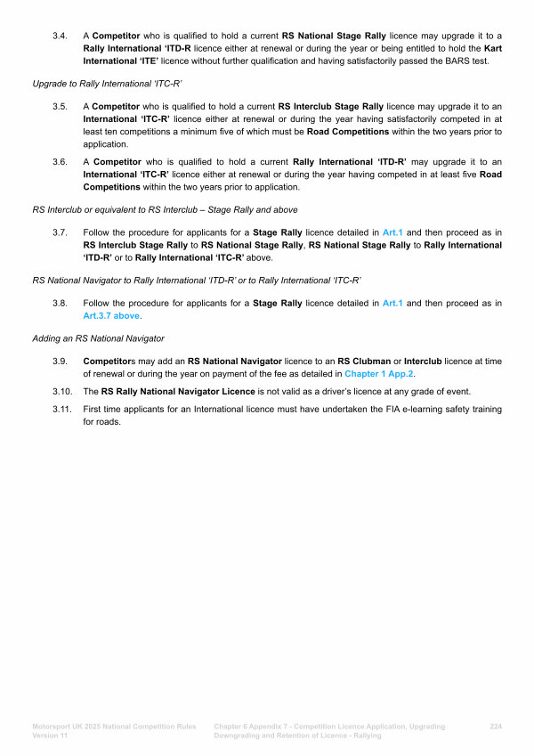 3.4. A Competitor who is qualified to hold a current RS National Stage Rally licence may upgrade it to a Rally International‘ ITD-R licence either at renewal or during the year or being entitled to hold the Kart International‘ ITE’ licence without further qualification and having satisfactorily passed the BARS test.