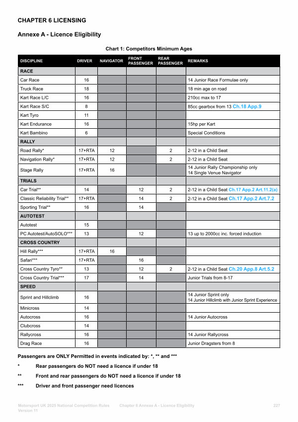 Passengers are ONLY Permitted in events indicated by: *, ** and *** * Rear passengers do NOT need a licence if under 18 ** Front and rear passengers do NOT need a licence if under 18 *** Driver and front passenger need licences