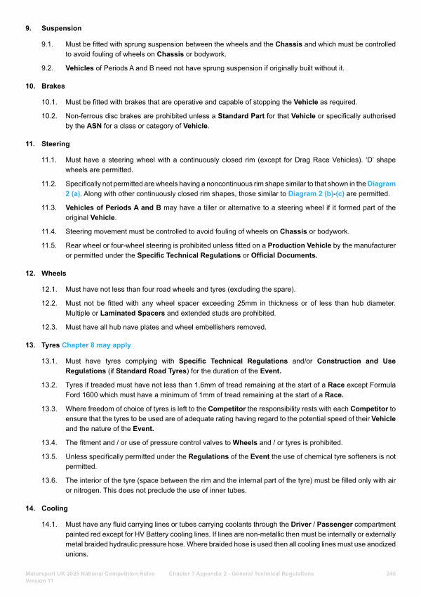 11.4. Steering movement must be controlled to avoid fouling of wheels on Chassis or bodywork.