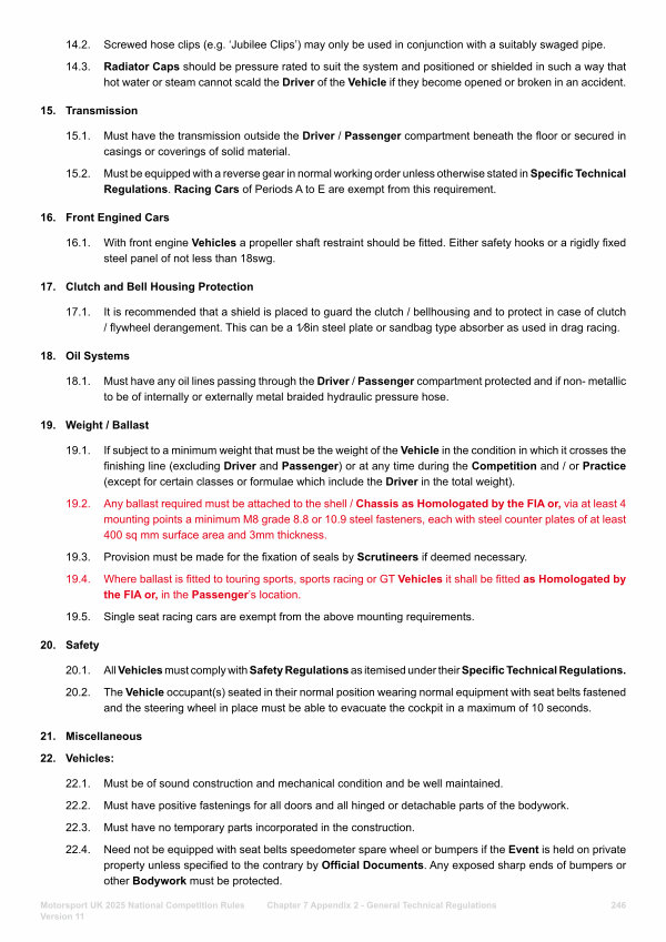 19.2. Any ballast required must be attached to the shell / Chassis as Homologated by the FIA or, via at least 4 mounting points a minimum M8 grade 8.8 or 10.9 steel fasteners, each with steel counter plates of at least 400 sq mm surface area and 3mm thickness.