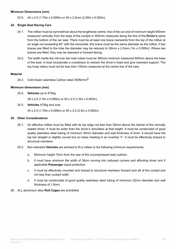 25.1. An effective rollbar must be fitted with its top edge not less than 50mm above the helmet of the normally seated driver. It must be wider than the driver’ s shoulders at that height. It must be constructed of good quality seamless steel tubing of minimum 35mm diameter and wall thickness of 2mm. It should have the top bar straight or slightly curved but no tubes meeting in an inverted‘ V’. It must be effectively braced to structural members.