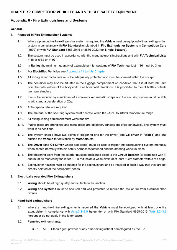 1.1. Where a plumbed-in fire extinguisher system is required the Vehicle must be equipped with an extinguishing system in compliance with FIA Standard for plumbed-in Fire Extinguisher Systems in Competition Cars( 1999) or with FIA Standard 8865-2015 or 8876-2022( for Single Seaters).