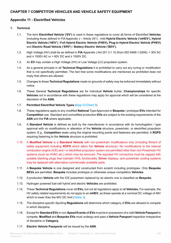 1.8. These regulations apply to any modified National Type Approved or Bespoke / prototype EVs intended for Competition use. Standard and unmodified production EVs are subject to the existing requirements of the ASN and the FIA where applicable.