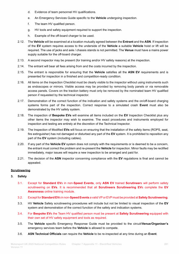 3.3. HV Vehicle Safety scrutineering procedures will include but not be limited to visual inspection of the EV system and demonstration of the correct function of the safety and indication systems.