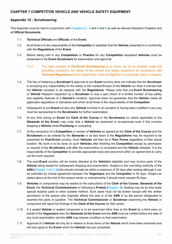 1.3. Before taking part in any Competition or Practice for any Competition requested Vehicles must be presented to the Event Scrutineers for examination and approval.