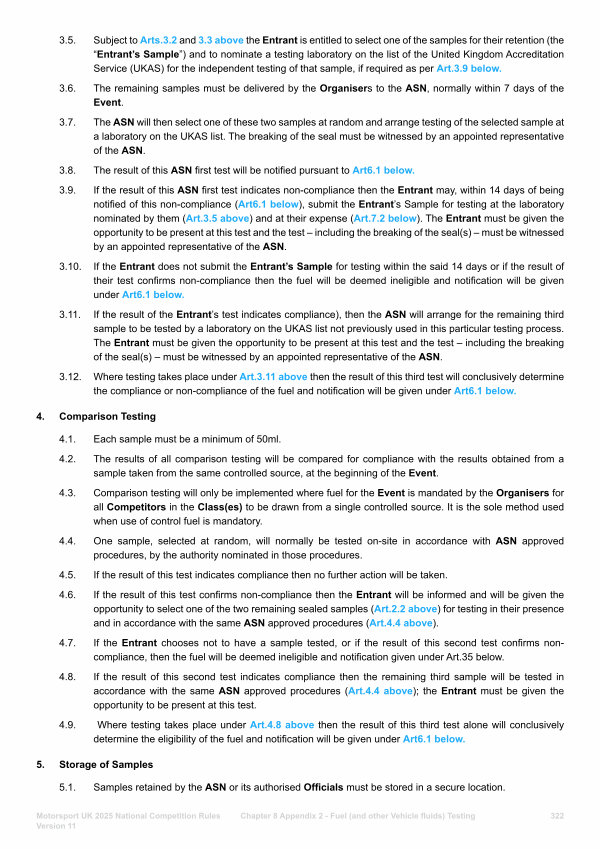 3.11. If the result of the Entrant’ s test indicates compliance), then the ASN will arrange for the remaining third sample to be tested by a laboratory on the UKAS list not previously used in this particular testing process. The Entrant must be given the opportunity to be present at this test and the test – including the breaking of the seal( s) – must be witnessed by an appointed representative of the ASN.