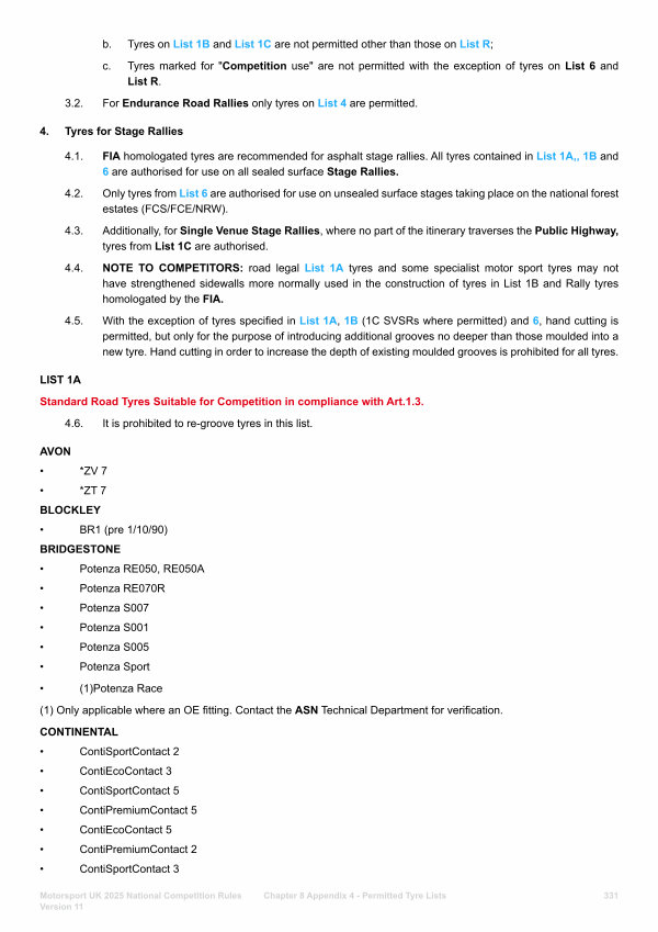 4.4. NOTE TO COMPETITORS: road legal List 1A tyres and some specialist motor sport tyres may not have strengthened sidewalls more normally used in the construction of tyres in List 1B and Rally tyres homologated by the FIA.