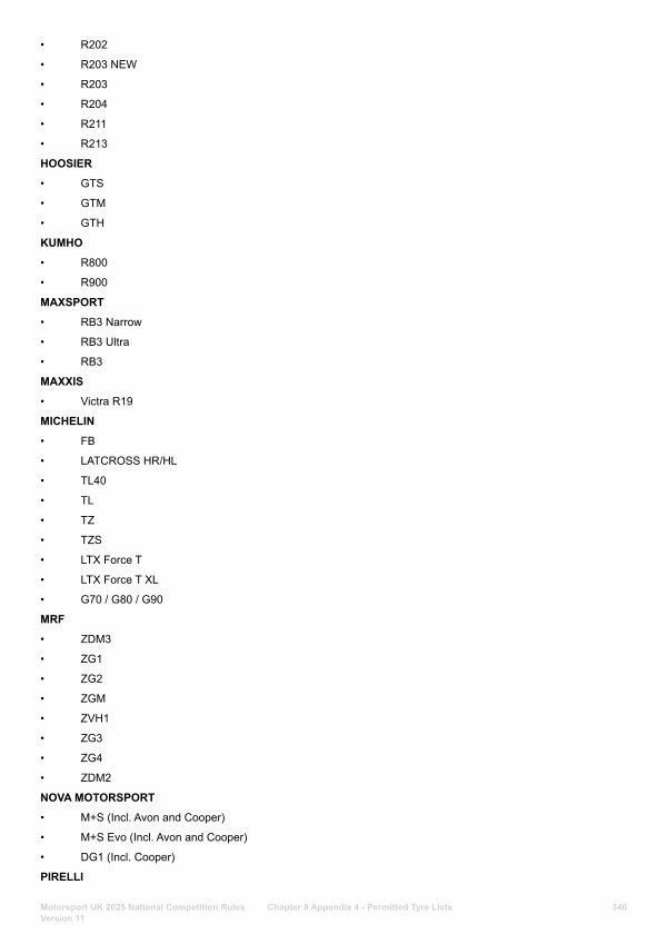 Chapter 8 Appendix 4- Permitted Tyre Lists 340