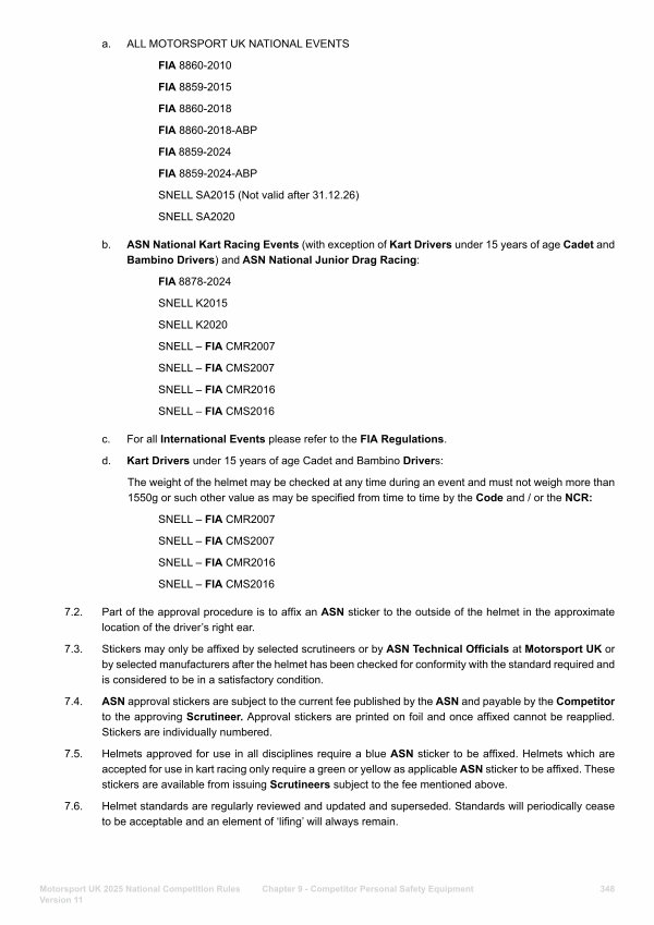 7.5. Helmets approved for use in all disciplines require a blue ASN sticker to be affixed. Helmets which are accepted for use in kart racing only require a green or yellow as applicable ASN sticker to be affixed. These stickers are available from issuing Scrutineers subject to the fee mentioned above.