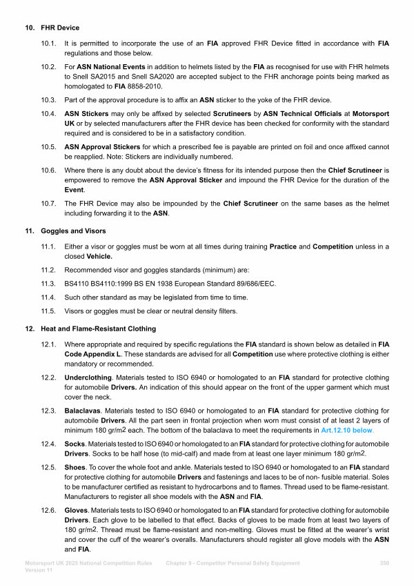 12.1. Where appropriate and required by specific regulations the FIA standard is shown below as detailed in FIA Code Appendix L. These standards are advised for all Competition use where protective clothing is either mandatory or recommended.