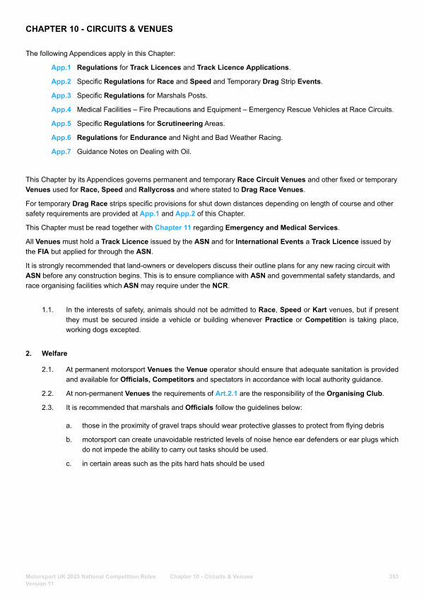 The following Appendices apply in this Chapter: App. 1 Regulations for Track Licences and Track Licence Applications. App. 2 Specific Regulations for Race and Speed and Temporary Drag Strip Events. App. 3 Specific Regulations for Marshals Posts. App. 4 Medical Facilities – Fire Precautions and Equipment – Emergency Rescue Vehicles at Race Circuits. App. 5 Specific Regulations for Scrutineering Areas. App. 6 Regulations for Endurance and Night and Bad Weather Racing. App. 7 Guidance Notes on Dealing with Oil.
