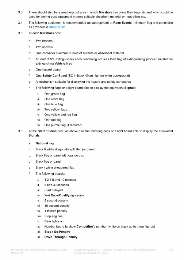 3.4. The following equipment is recommended( as appropriate) at Race Events( minimum flag and panel size as provided in Chapter 12.