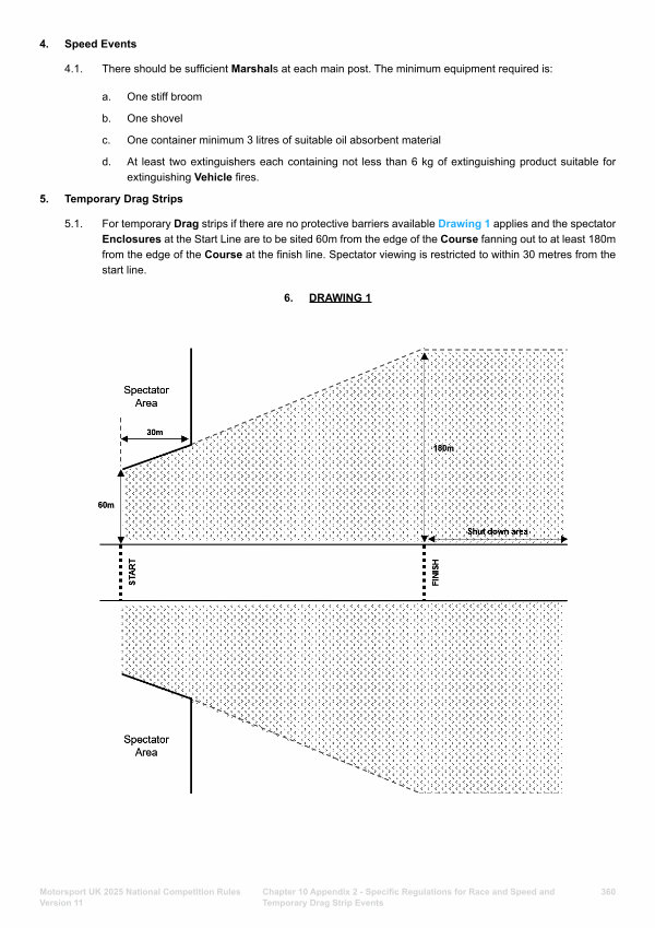 5.1. For temporary Drag strips if there are no protective barriers available Drawing 1 applies and the spectator Enclosures at the Start Line are to be sited 60m from the edge of the Course fanning out to at least 180m from the edge of the Course at the finish line. Spectator viewing is restricted to within 30 metres from the start line.