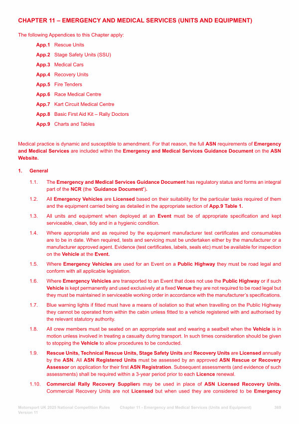 The following Appendices to this Chapter apply: App. 1 Rescue Units App. 2 Stage Safety Units( SSU) App. 3 Medical Cars App. 4 Recovery Units App. 5 Fire Tenders App. 6 Race Medical Centre App. 7 Kart Circuit Medical Centre App. 8 Basic First Aid Kit – Rally Doctors App. 9 Charts and Tables