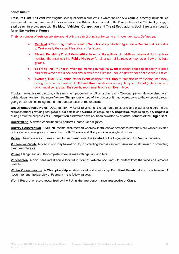 Classic Reliability Trial. A Competition based on the ability to climb hills or traverse difficult sections nonstop, that may use the Public Highway for all or part of its route or may be entirely on private ground.