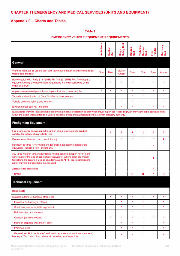 Table 1 EMERGENCY VEHICLE EQUIPMENT REQUIREMENTS