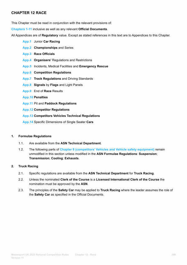 This Chapter must be read in conjunction with the relevant provisions of: Chapters 1-11 inclusive as well as any relevant Official Documents. All Appendices are of Regulatory value. Except as stated references in this text are to Appendices to this Chapter. App. 1 Junior Car Racing App. 2 Championships and Series App. 3 Race Officials App. 4 Organisers’ Regulations and Restrictions App. 5 Incidents, Medical Facilities and Emergency Rescue App. 6 Competition Regulations App. 7 Track Regulations and Driving Standards App. 8 Signals by Flags and Light Panels App. 9 End of Race Results App. 10 Penalties App. 11 Pit and Paddock Regulations App. 12 Competitor Regulations App. 13 Competitors Vehicles Technical Regulations App. 14 Specific Dimensions of Single Seater Cars
