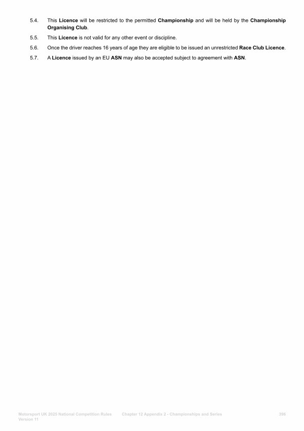 5.5. This Licence is not valid for any other event or discipline. 5.6. Once the driver reaches 16 years of age they are eligible to be issued an unrestricted Race Club Licence. 5.7. A Licence issued by an EU ASN may also be accepted subject to agreement with ASN.