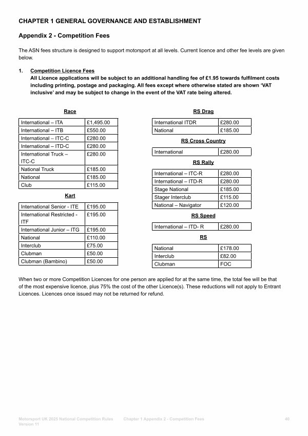 1. Competition Licence Fees All Licence applications will be subject to an additional handling fee of £ 1.95 towards fulfilment costs including printing, postage and packaging. All fees except where otherwise stated are shown‘ VAT inclusive’ and may be subject to change in the event of the VAT rate being altered.