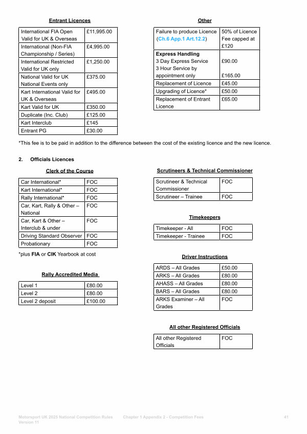 Kart Valid for UK £ 350.00 Duplicate( Inc. Club) £ 125.00 Kart Interclub £ 145 Entrant PG £ 30.00
