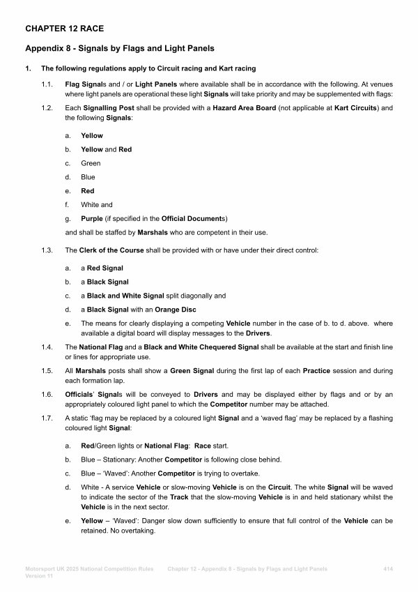 1.6. Officials’ Signals will be conveyed to Drivers and may be displayed either by flags and or by an appropriately coloured light panel to which the Competitor number may be attached.