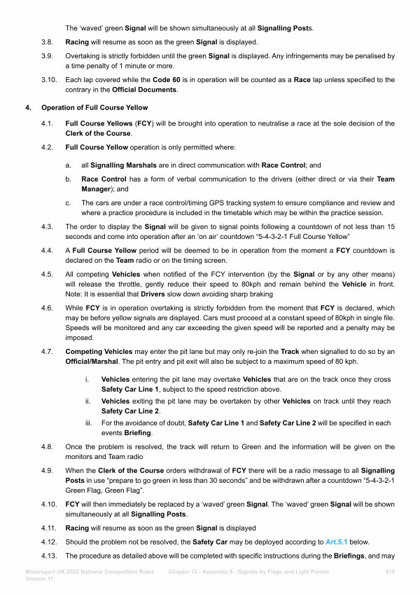 4.11. Racing will resume as soon as the green Signal is displayed 4.12. Should the problem not be resolved, the Safety Car may be deployed according to Art. 5.1 below. 4.13. The procedure as detailed above will be completed with specific instructions during the Briefings, and may