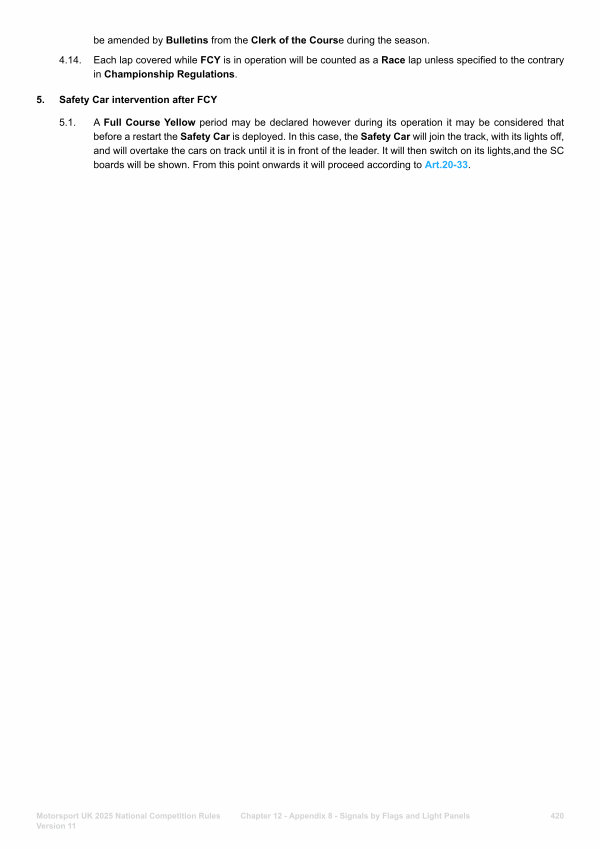 5.1. A Full Course Yellow period may be declared however during its operation it may be considered that before a restart the Safety Car is deployed. In this case, the Safety Car will join the track, with its lights off, and will overtake the cars on track until it is in front of the leader. It will then switch on its lights, and the SC boards will be shown. From this point onwards it will proceed according to Art. 20-33.