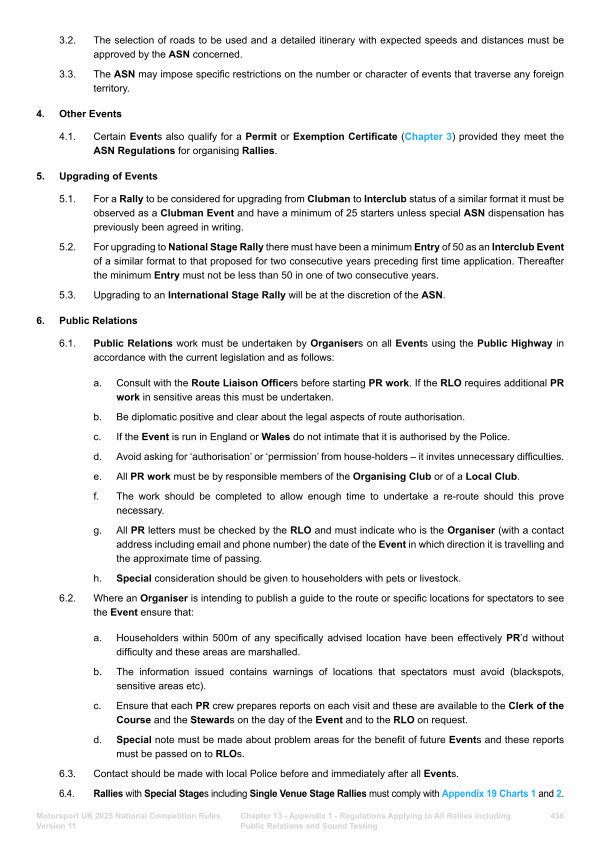 5.1. For a Rally to be considered for upgrading from Clubman to Interclub status of a similar format it must be observed as a Clubman Event and have a minimum of 25 starters unless special ASN dispensation has previously been agreed in writing.