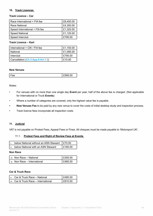11. Judicial VAT is not payable on Protest Fees, Appeal Fees or Fines. All cheques must be made payable to‘ Motorsport UK’.