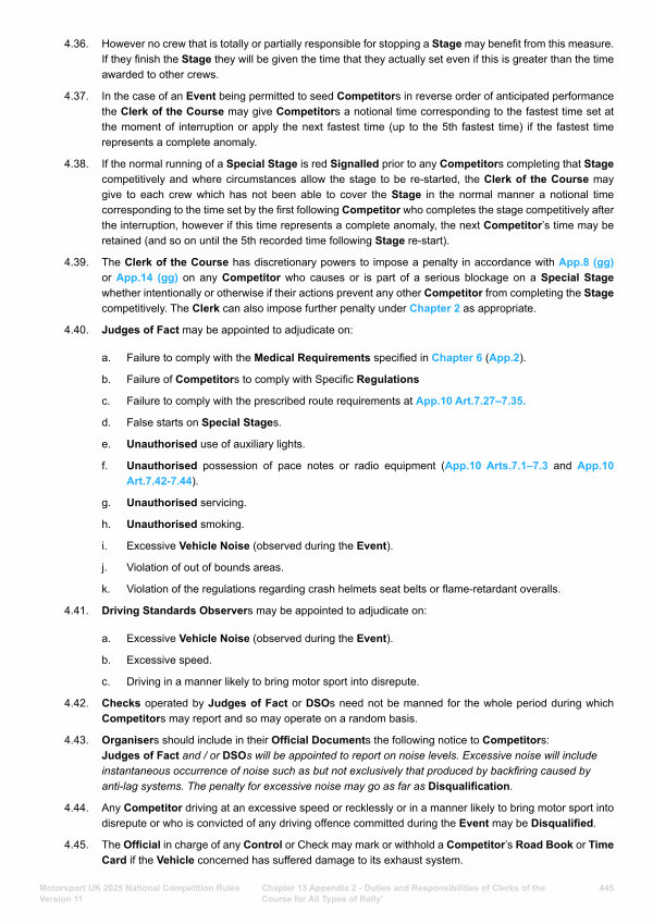 4.43. Organisers should include in their Official Documents the following notice to Competitors: Judges of Fact and / or DSOs will be appointed to report on noise levels. Excessive noise will include instantaneous occurrence of noise such as but not exclusively that produced by backfiring caused by anti-lag systems. The penalty for excessive noise may go as far as Disqualification.